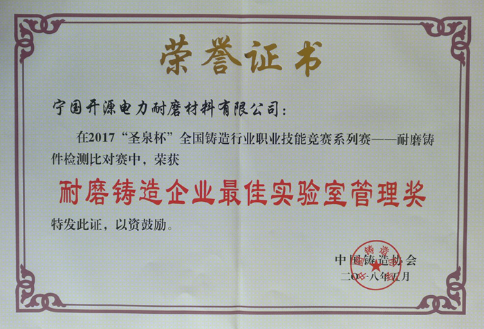 初夏五月,花開(kāi)似錦,綠樹(shù)成蔭。勞動(dòng)的季節(jié)里,一派生機(jī)盎然,更有喜訊捷報(bào)傳來(lái)。在“圣泉杯”全國(guó)鑄造行業(yè)職業(yè)技能競(jìng)賽系列賽---耐磨鑄件檢測(cè)比對(duì)賽中,開(kāi)源耐磨榮獲中鑄協(xié)頒發(fā)的“耐磨鑄造企業(yè)最佳實(shí)驗(yàn)室管理獎(jiǎng)”。 在同行業(yè)諸多好手中脫穎而出獲得這一獎(jiǎng)項(xiàng),一方面體現(xiàn)了我司超越領(lǐng)先的技術(shù)檢測(cè)能力,另一方面獲得這一榮譽(yù),也是我司長(zhǎng)期持久、精益求精的實(shí)驗(yàn)室管理工作的成果,更是對(duì)我司實(shí)驗(yàn)室管理工作的極大褒獎(jiǎng)。